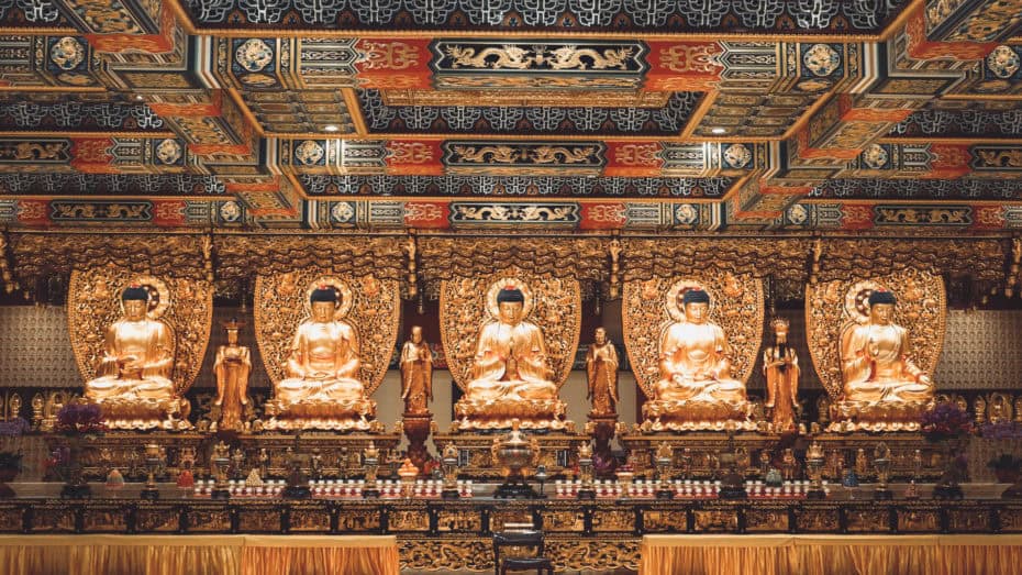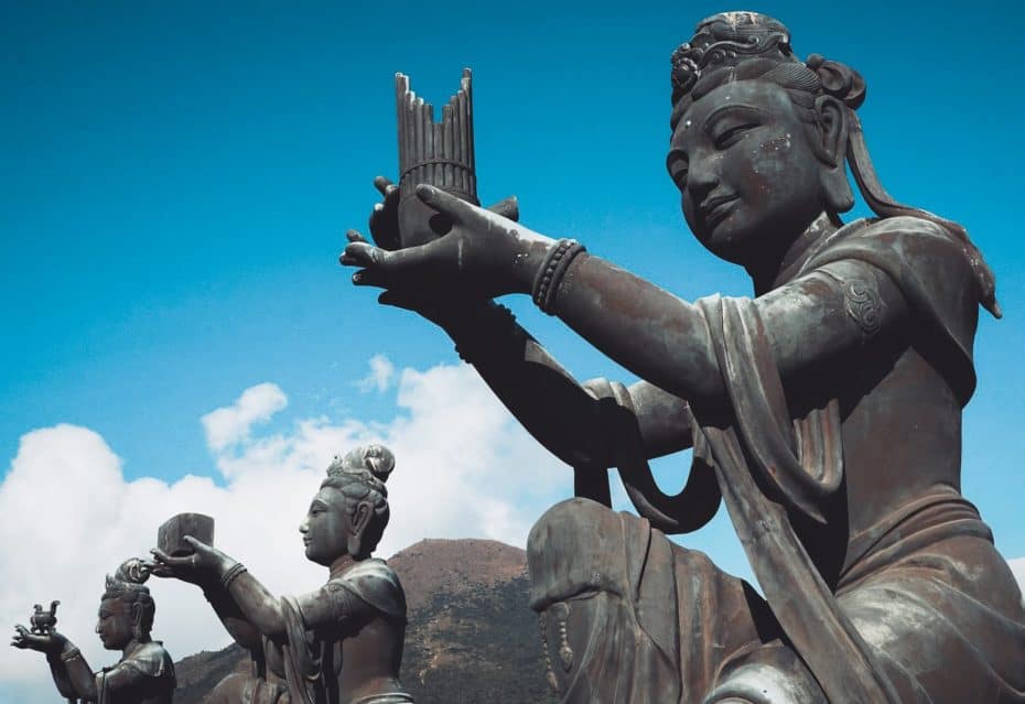 Le Grand Bouddha est assis sur un trône de lotus, symbole de pureté. Après avoir monté les marches, tu accéderas à une grande plateforme qui entoure la statue. Dessus, tu pourras admirer six petites statues en bronze dont la « scène » représente « L’offrande des six Devas« . Et c’est tout un symbole ! Les 6 statues offrent au Bouddha des objets qui représentent chacun une perfection ou vertu : une lampe (la patience), des fleurs (la générosité), de l’encens (la Morale), une pommade (l’énergie), de la musique (la sagesse) et des fruits (la méditation). Ce sont les 6 vertus (ou perfections) pour accéder à l’Illumination.