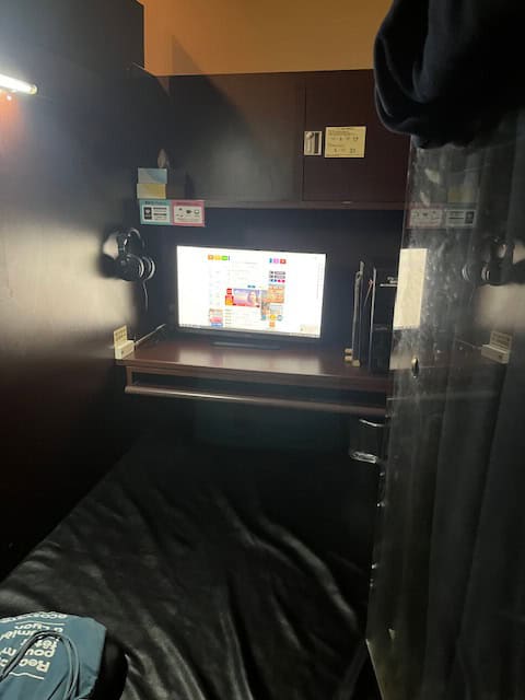 Tu trouveras un lit dans un espace dortoir en capsule pour 7 250 yens environ.