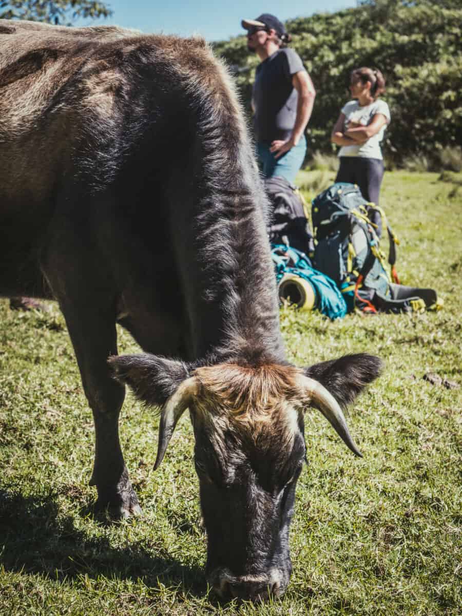 Donc, pour le décor de l’histoire : le plateau de Kerval ! Une étendue plutôt plate, magnifique, nichée au creux de ce que l’île de la Réunion a probablement fait de plus beau : le cirque de Mafate. Ce plateau d’herbes folles est un endroit idyllique où coule un ruisseau. Il prend sa source depuis les falaises majestueuses et vient s’étendre d’eau, au milieu de Kerval, avant de continuer son chemin quelques centaines de mètres plus bas, roucoulant entre les pierres volcaniques. Les oiseaux gazouillent, les chiens batifolent, la terre accueille, le lieu enchante, les vaches meuglent. Parfait !