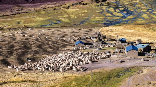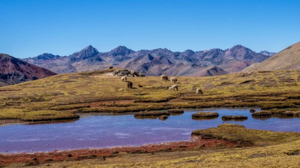 Quelques petites maisons isolées, puis très vite, les troupeaux d’alpagas apparaissent sur fond de sommets enneigés : l’Ausangate se dévoile peu à peu. On traverse des plateaux andins ouverts avant d’atteindre le camp d’Upis, idéalement situé près de sources chaudes.