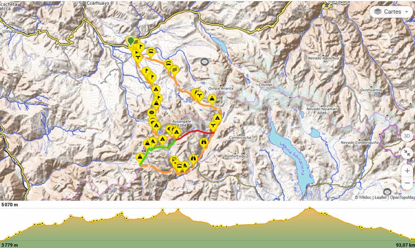 - Itinéraire alternatif boucle Ausangate : Tinki → Upis → Ausangatecocha → Vinicunca → Ausangatecocha → Camp Jampa → Pacchanta → Tinki.