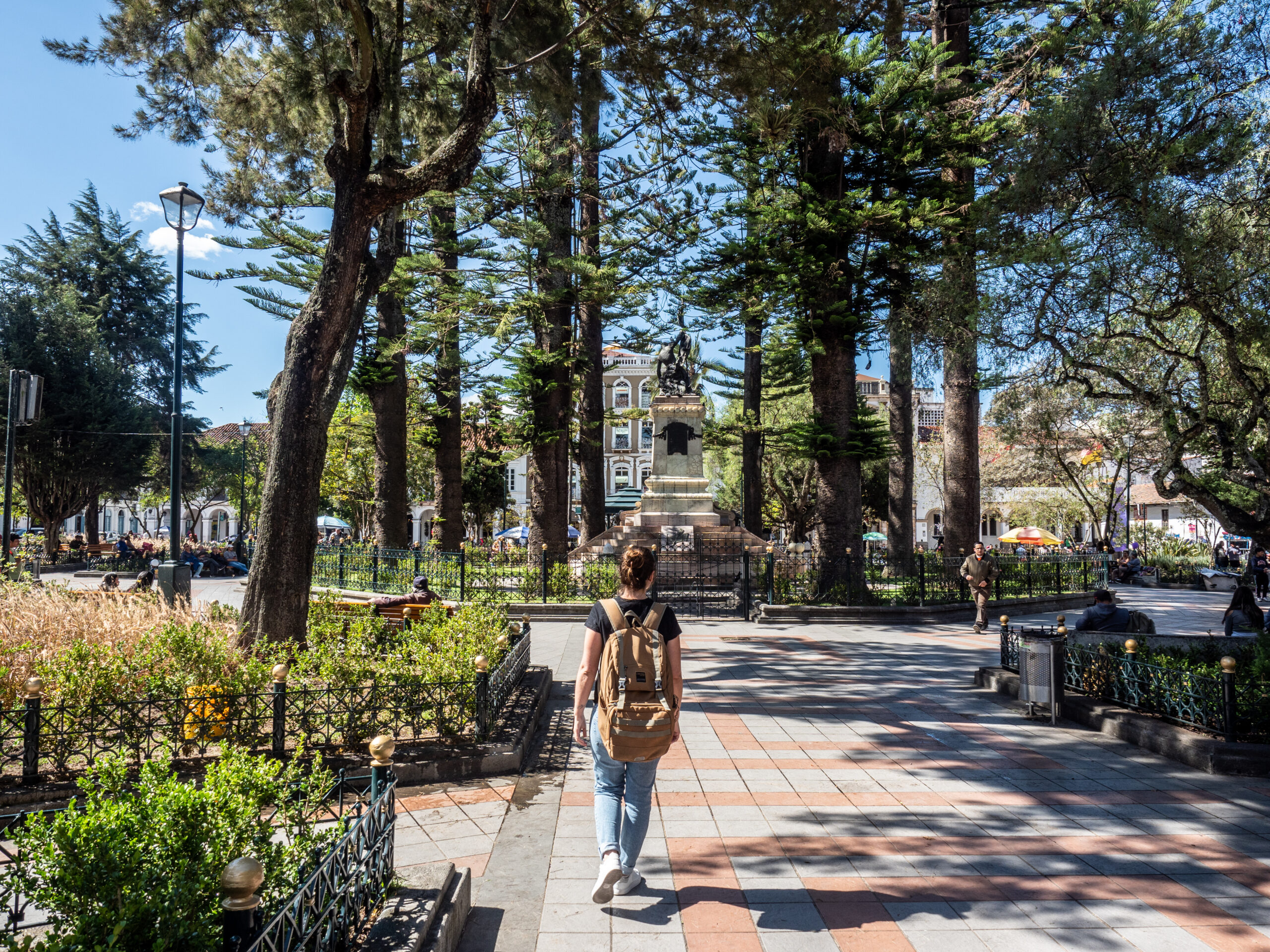 Le “salon” de Cuenca : pelouses impeccables, kiosque central, façades historiques, cafés sous arcades et quelques bancs pour se poser. Autour du monument d’Abdón Calderón, tu remarqueras de grandes araucarias (des arbres) qui encadrent la place.