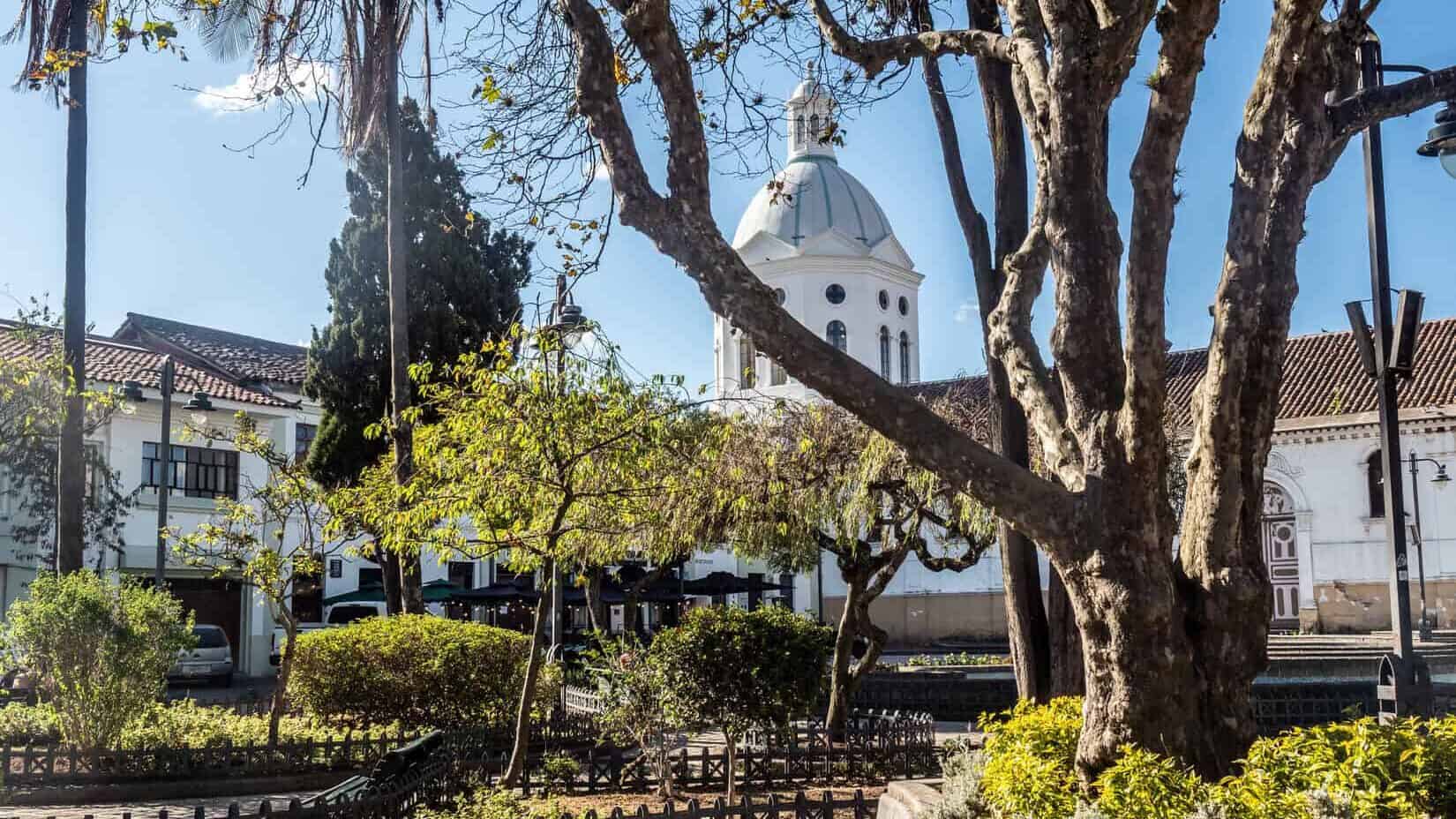 - Iglesia Santísimo Rosario (Santo Domingo) : à l’angle de Padre Aguirre et Gran Colombia, cette église moins connue tranche avec le style colonial habituel. Construite au début du XXᵉ siècle dans un style de nouveau classicisme, elle est reconnaissable à ses clochers coiffés de dômes en mosaïque et à ses pseudo-colonnes intégrées aux façades. À l’intérieur, les hautes fenêtres inondent la nef de lumière et révèlent des peintures murales aux tons verts et orangés, surprenant pour une église. Un petit détour qui vaut le coup d’œil.