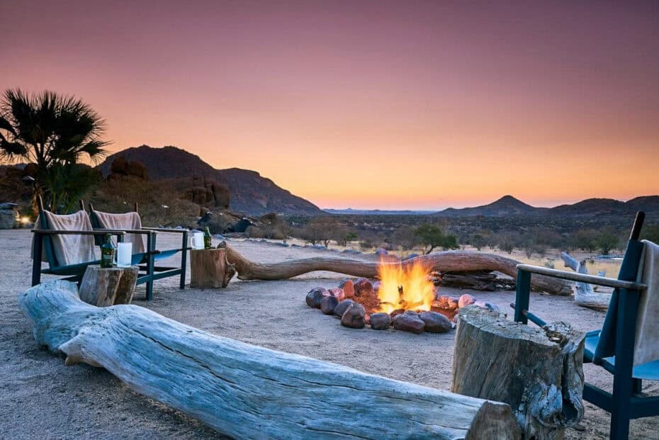 Déjà, l’emplacement est exceptionnel ! Tu seras au plein cœur d’un univers minéral impressionnant et particulièrement photogénique au lever et au coucher du soleil. Et justement, pour le coucher du oleil, ce qu’on a adoré c’est de se poser près du brasero à regarder la nuit tomber et les étoiles apparaitre dans le Damaraland. Le petit déjeuner est très bon et le restaurant sert également de délicieux repas le soir.